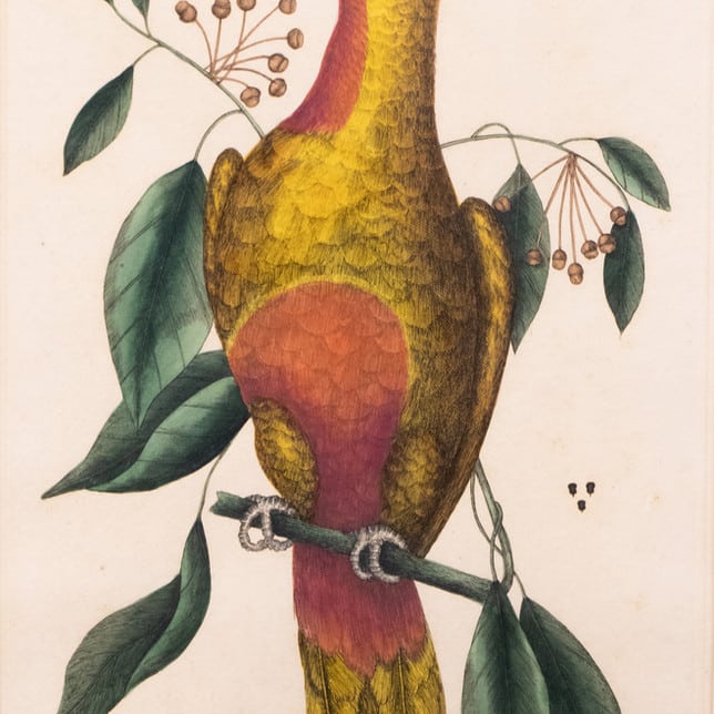 The two-volume set, The Natural History of Carolina, Florida, and the Bahama Islands contained more than 100 plates of birds, as well as illustrations of fish and snakes. A pioneer in ornithology, Catesby created images of birds and other animals which established a format for later artist-naturalists such as Alexander Wilson and John James Audubon. Catesby’s text was also an important contribution to European knowledge of America.