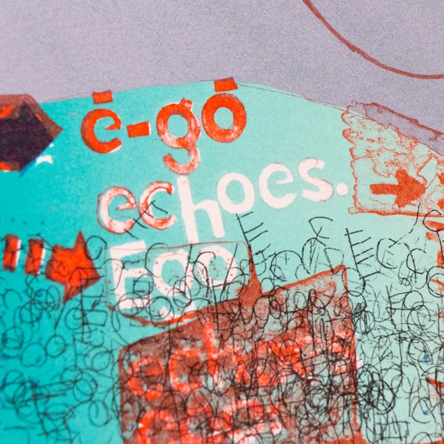 Ego Echo is the more colorful of the two Ruth Knight Laxson prints in Spartanburg Art Museum’s collection. Featuring vibrant teal and cherry red inks along with