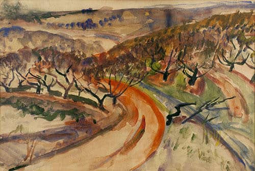 In Peach Orchard, however, their and other southerners’ presence is implicit rather than explicit. Only a country road meandering into the distance interrupts the feeling of quiet imposed by rolling hills and carefully ordered rows of fruit trees. But the vivid palette and gestural painting technique characteristic of her figure paintings reveals itself here, too – in her energetic rendering of the peach trees’ dark, gnarled branches.