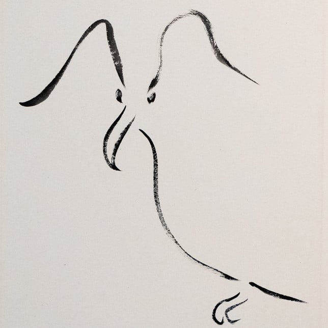 Helen DuPré Moseley created her ink drawings early in her artistic career. The dramatic “eyebrows” of the avian figure mimic the plumage of the Saxony Bird of Paradise, known for its antennae-like head feathers.