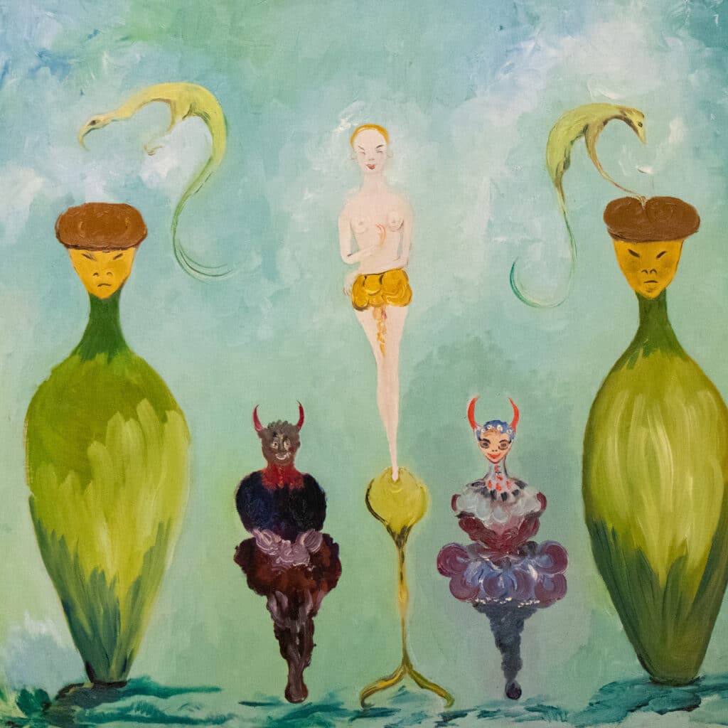 With such myriad influences and comparisons, it’s no wonder that Moseley’s thematic material varies widely within her work. Animal-human hybrid creatures, social commentary, authority figures, masked individuals, and religious rituals can all be found within her paintings. While these elements can invoke fear, confusion, and other powerful emotions, there exists an underlying element of humor and playfulness, with bright cheerful colors juxtaposed against serious symbolic imagery. Though jarring upon first glance, with closer examination on can find numerous meanings embedded in her work.