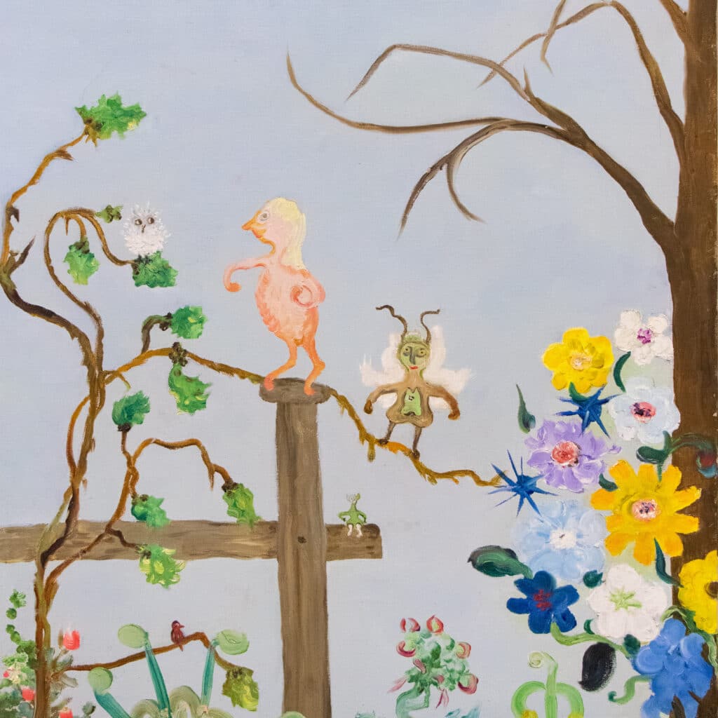 With such myriad influences and comparisons, it’s no wonder that Moseley’s thematic material varies widely within her work. Animal-human hybrid creatures,  social commentary, authority figures, masked individuals, and religious rituals can all be found within her paintings. While these elements can invoke fear, confusion, and other powerful emotions, there exists an underlying element of humor and playfulness, with bright cheerful colors juxtaposed against serious symbolic imagery. Though jarring upon first glance, with closer examination on can find numerous meanings embedded in her work.