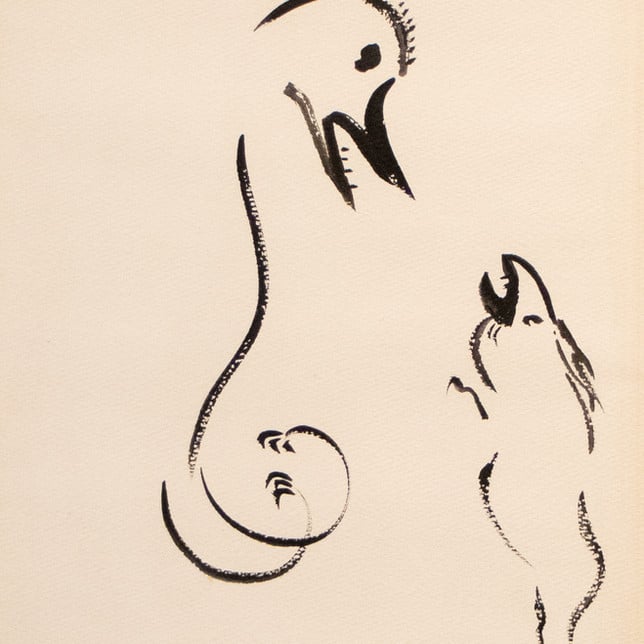 Helen DuPré Moseley created her ink drawings early in her artistic career. These two minimal and ambiguous features can be interpreted as many different animals—perhaps a seahorse, a swan or goose, a rabbit or hamster.