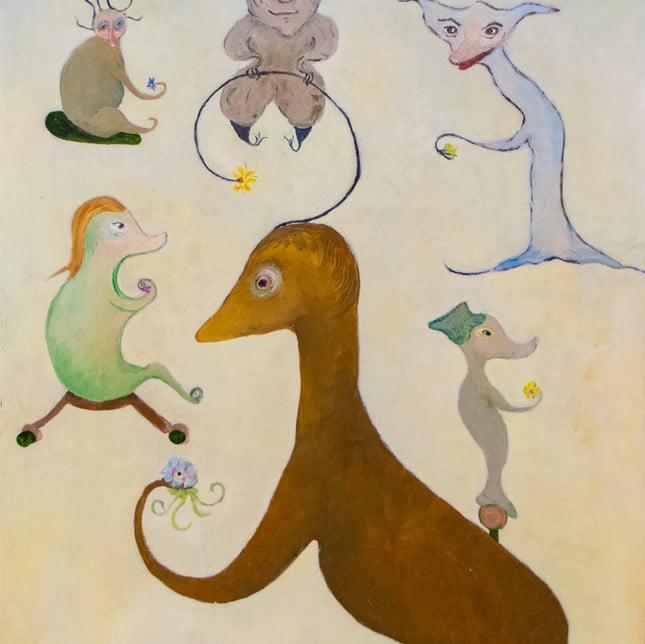 With such myriad influences and comparisons, it’s no wonder that Moseley’s thematic material varies widely within her work. Animal-human hybrid creatures, social commentary, authority figures, masked individuals, and religious rituals can all be found within her paintings. While these elements can invoke fear, confusion, and other powerful emotions, there exists an underlying element of humor and playfulness, with bright cheerful colors juxtaposed against serious symbolic imagery. Though jarring upon first glance, with closer examination on can find numerous meanings embedded in her work.
