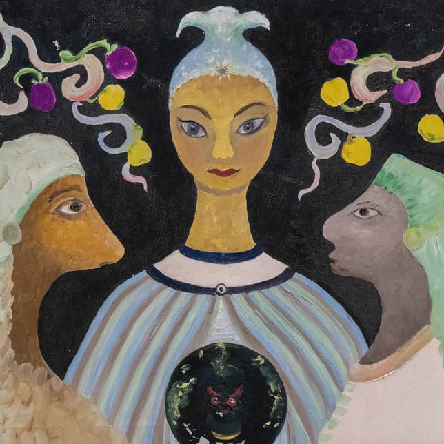 With such myriad influences and comparisons, it’s no wonder that Moseley’s thematic material varies widely within her work. Animal-human hybrid creatures, social commentary, authority figures, masked individuals, and religious rituals can all be found within her paintings. While these elements can invoke fear, confusion, and other powerful emotions, there exists an underlying element of humor and playfulness, with bright cheerful colors juxtaposed against serious symbolic imagery. Though jarring upon first glance, with closer examination on can find numerous meanings embedded in her work.