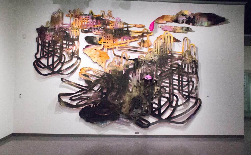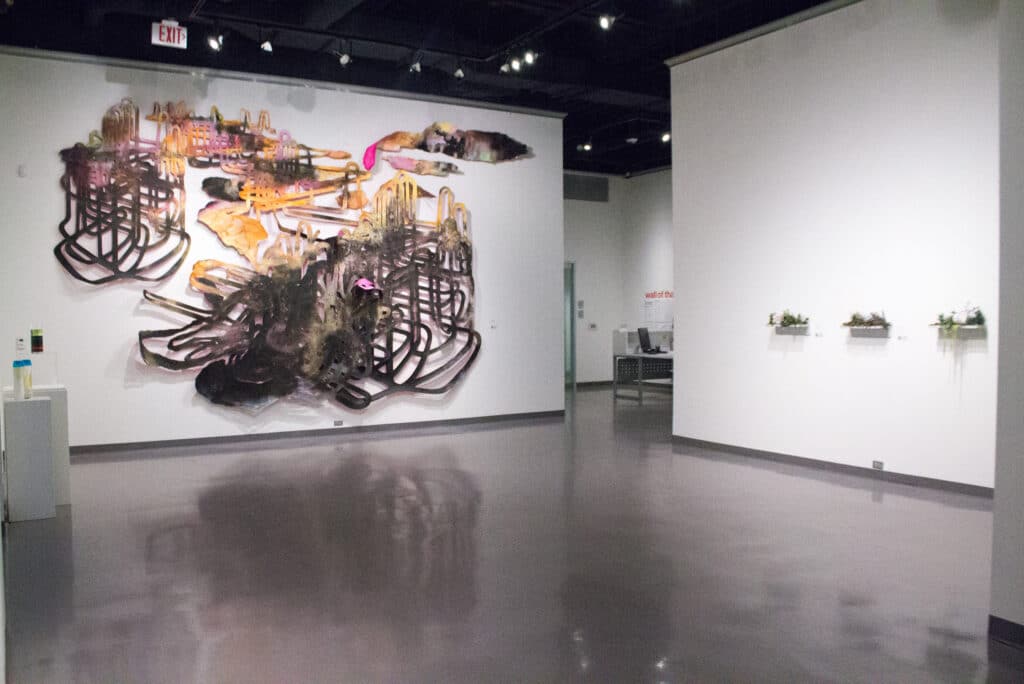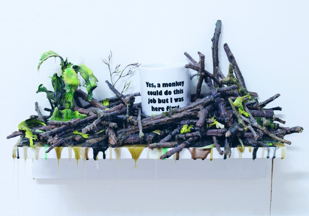 The works in Unnatural History are portals backwards or forwards (or sometimes both at once) in geologic time, offering visions from before, after, and during the tenancy of humankind. Dioramas of cast resin depicting bizarre plants and animate slime suggest a post-human period wherein nature reclaims the planet. Abstract wall sculptures use motor and crude oil as raw material in the depiction of the vast, intricate industrial landscapes of the near future, while wooden mosaics made of materials salvaged from hurricane-affected cities and reconstructed glass objects found on beaches suggest a possible utopian remedy to decline, decay, and disintegration.